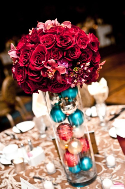 Mariage de noël deco table rose rouge boules