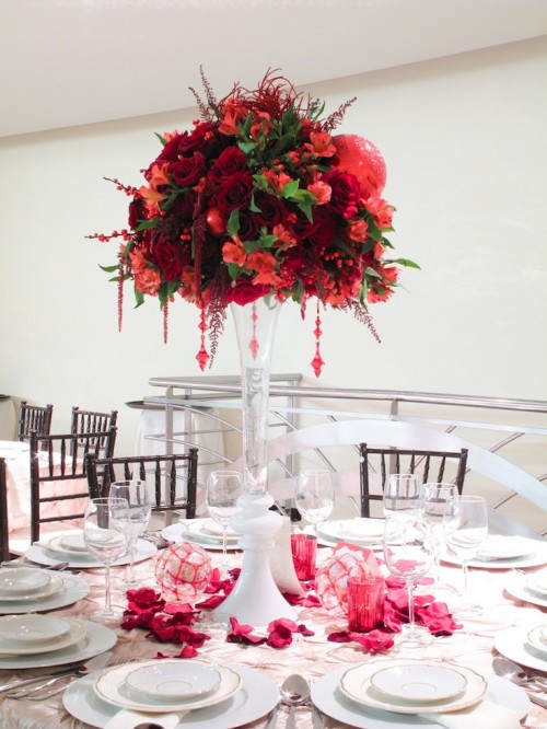 Mariage de noël deco table rose rouge rose magenta bouquet
