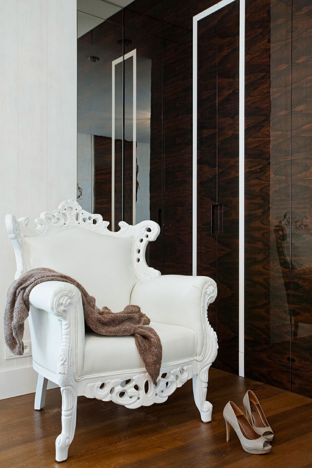 Fauteuil rétro contraste déco moderne armoire lustrée
