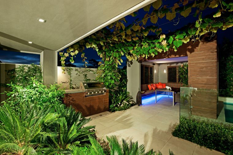Cour interieure jardin vert lumieres barbeque