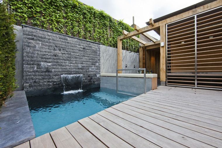 Cour interieure bassin chute d eau revetement sol bois