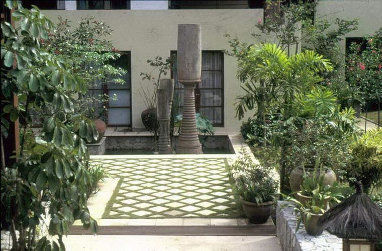 Cour interieure geometrique originale sculptures verdure