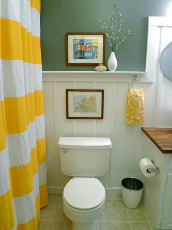 Salle bain rideaux jaune blanc