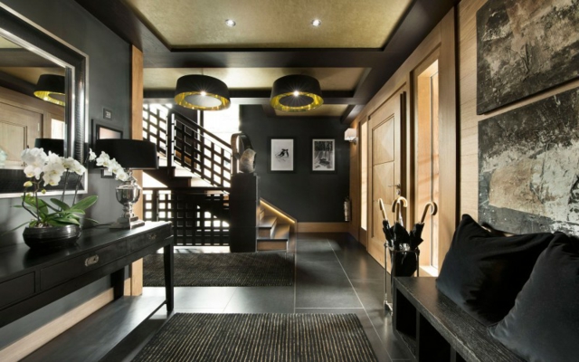 Chalet de luxe interieur riche et elegant fonce contraste neige